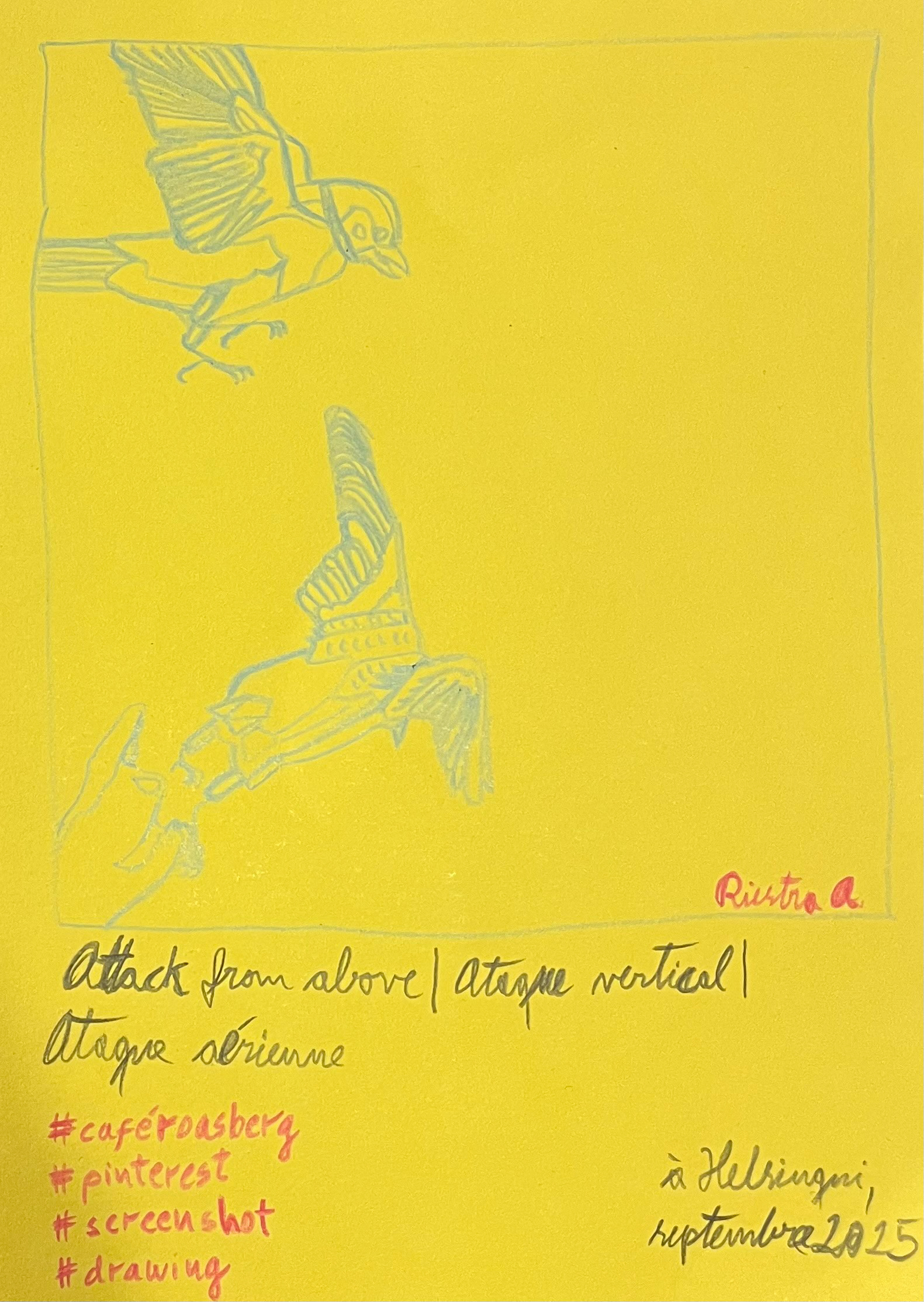 Composition with pigeons, Helsinki 2022; Color pencil and pencil on aquarelle paper